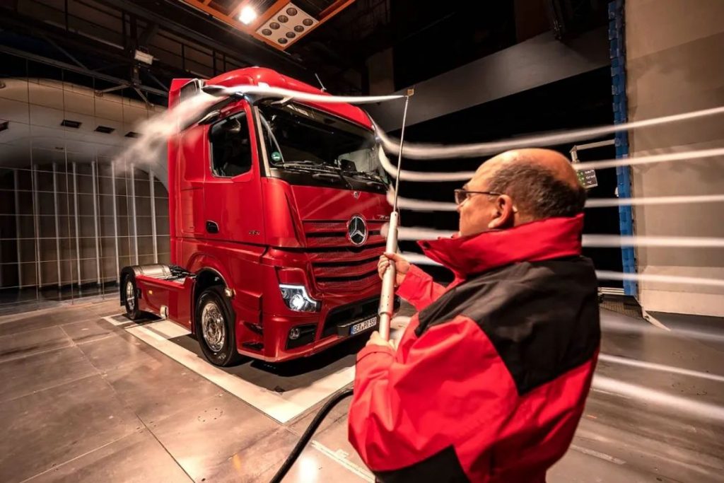 不久前奔驰卡车的一篇新闻稿显示,新Actros卡车在戴姆勒股份公司Untertürkheim工厂的风洞中进行了严格的测试。据了解该风洞的轴流风机能够产生每小时250公里的风速。空气动力学测量在道路测试中得到验证。