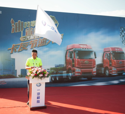 步入比赛现场,首先映入眼帘的就是整齐摆放在发车区的20辆比赛用车,红色颜色的车身在蓝天白云的映照下尽显王者之姿,格外威武。伴着激昂的开场音乐,本次节油大赛正式拉开帷幕!比赛发车仪式开始,一汽解放汽车销售有限公司四川商代处姜文卿经理登台致辞。姜经理讲到,一汽解放从“第一辆”到“第一名”,可以说是中国汽车工业当之无愧的开拓者。本次节油大赛,参赛选手们也将用自己的实力证明,拥有解放是自己不后悔的选择。同时希望通过节油大赛总结卡友们的节油心得,广惠大众,让解放卡车真正的成为卡友们的挣钱机器。