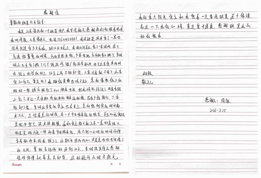 2026年新春期间,欧曼践行服务承诺,推出“新春服务不打烊”专项保障活动,搭建全时段响应、全域覆盖的服务网络,用实打实的专业能力和高效响应,为奔波在运输一线的卡友筑牢出行保障,解决运输途中的突发难题。活动开展以来,欧曼始终坚守“以客户为中心”的服务底线,每一次救援、每一次服务都聚焦卡友实际需求,也正因这份务实,收获了无数用户的真心认可。近日,山东客户周先生专程送来锦旗和亲笔手写感谢信,用最真诚的方式,为欧曼的高效救援服务点赞,这不仅是对一线服务人员的肯定,更是对欧曼整体服务体系的认可。