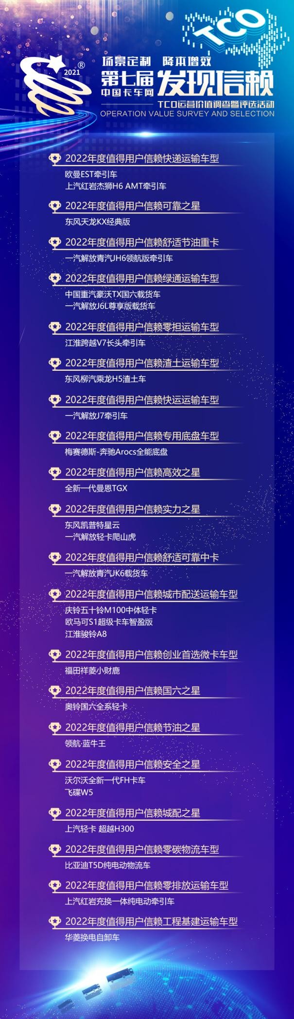 每一次评选,都是卡车应用群体的智慧汇集,每一次信赖,都是卡车制造企业的高光时刻。正是这些奋斗在一线的物流用户才让“可信赖”有了具体的内涵,正是这些值得信赖的卡车产品点亮了2021年的卡车和物流运输行业。作为行业专门媒体,中国卡车网以信赖连接用户、产品和企业,以信赖推动产品价值,更以信赖铸就行业品牌长城,在专业、价值、分享之下,信赖的力量才能不断发酵,卡车的生命力也将更加鲜活和持久。