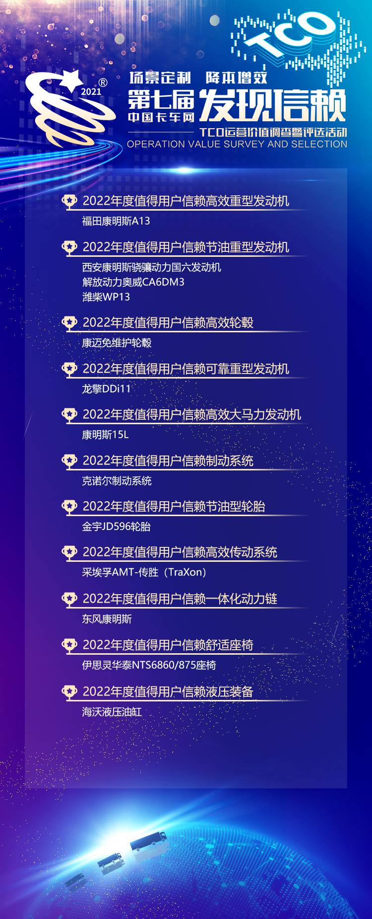 除了核心动力系统外,其它的零部件产品也非常收用户的关注。其中,2022年度值得用户信赖高效轮毂被康迈免维护轮毂荣获;克诺尔制动系统荣获2022年度值得用户信赖制动系统;金宇JD596轮胎2022年度值得用户信赖 节油型轮胎;采埃孚AMT-传胜(TraXon)荣获2022年度值得用户信赖高效传动系统;伊思灵华泰NTS6860/875座椅成为了2022年度值得用户信赖 舒适座椅的获奖得主;海沃液压油缸则将2022年度值得用户信赖液压装备收入囊中。