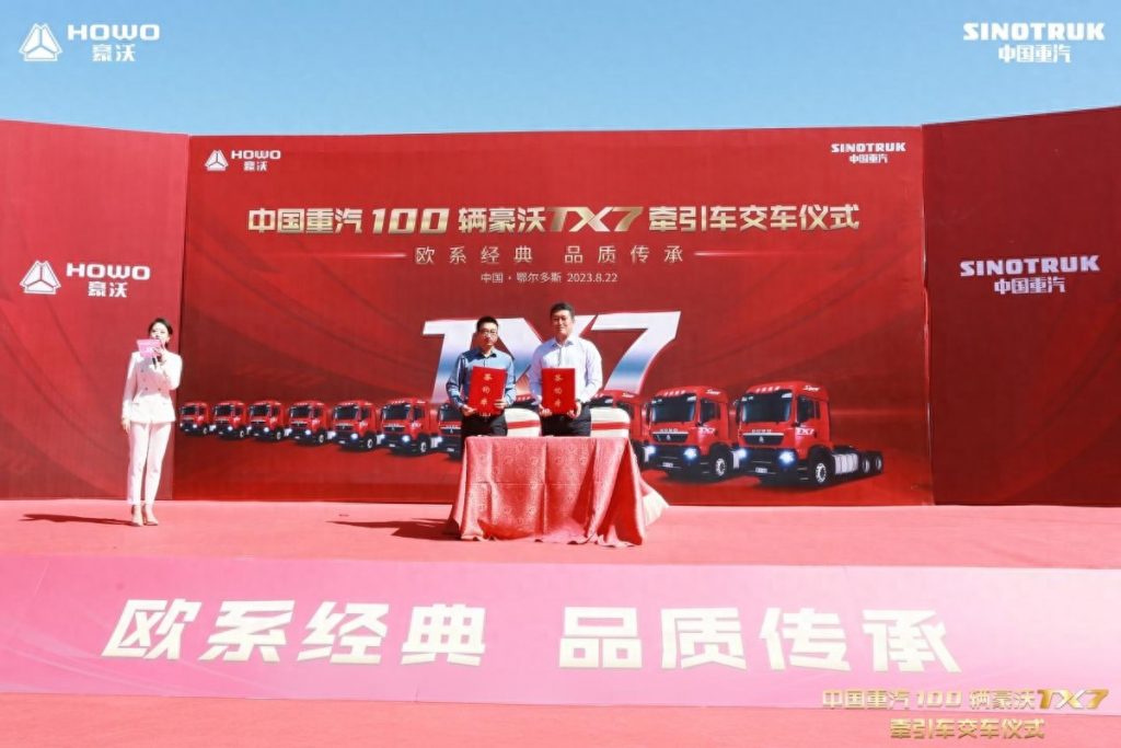2023年8月22日,中国重汽豪沃TX7牵引车100台交车仪式在内蒙古鄂尔多斯市圆满举行。豪沃TX7牵引车的卓越品质再次得到行业领袖客户的认可。